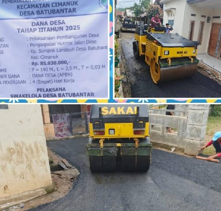 Terpantau dilokasi pelaksanaan pembangunan Hotmix jalan desa ini tertera juga di papan informasi tepatnya di Kp.Sompok Landeuh dengan nilai Rp.85 .930.000.- dengan P.Volume-140.L-2,5 M.T-0,03 M Sumber dana desa (APBN) Ta-2025.dengan waktu Empat hari kerja dan pelaksana ,Swakelola Desa Batubantar.